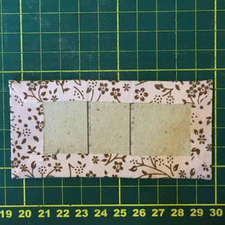 Dobre ao meio os 4 recortes de papel de scrapbook 7,5 x 4,5 cm. Dobrados os recortes ficarão 3,75 x 4,5 cm.