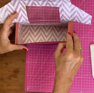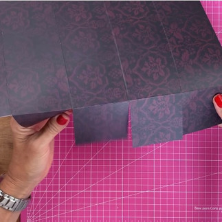 Antes de colar as 3 tiras, verifique se encaixam nas bordas. Coloque as tiras dobradas 1/2 dobra do lado de dentro da caixa e a outra 1/2 dobra do lado de fora da caixa. Se precisa corte na largura para caber. Quando estiverem na medida certa